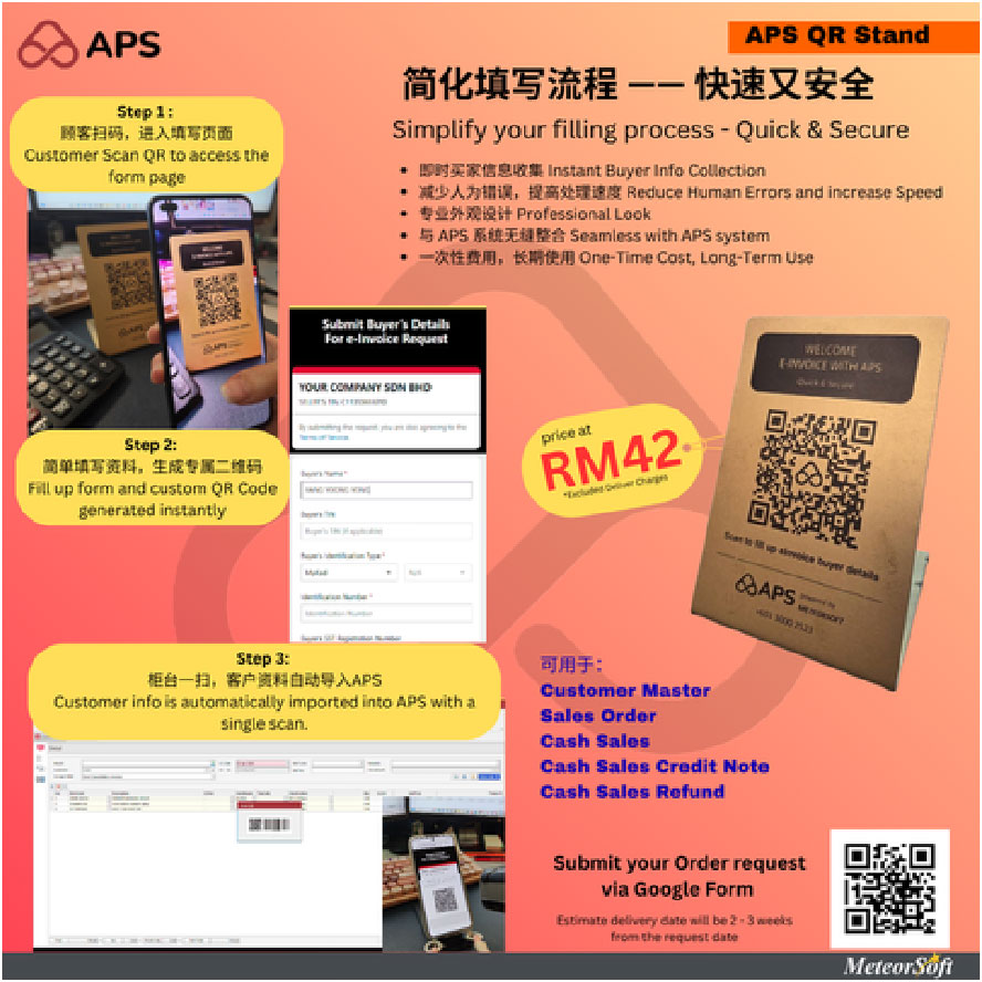 APS stays fully aligned with the latest LHDN rules by auto-updating MSIC codes, product classifications, and UOM. This keeps every invoice compliant, reduces rejections, and removes the need for manual adjustments—saving time and preventing errors.